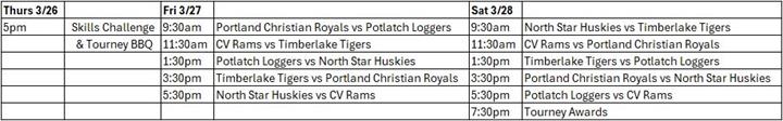 The tourney kicks off with the Skills challenge & Tourney BBQ on Thursday 3/26 at 5:00pm. All games will take place on Friday 3/27 & Saturday 3/28 with each team playing two games on both days. Each team will be home team for two games and visitors for two games. Home team is the second team listed on the game schedule below.