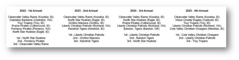 The 2026 tourney field is set with the following teams competing: Clearwater Valley Rams (Kooskia, ID), Potlatch Loggers (Potlatch, ID), Portland Christian Royals (Portland, OR), Timberlake Tigers (Spirit Lake, ID) & The North Star Charter Huskies (Eagle, ID).